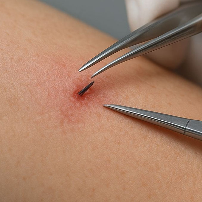 Procedimento realizado para remover materiais ou fragmentos (como lascas de madeira, espinhos, vidros, metais ou outros objetos) e insetos (como “berne”) que penetraram na pele ou nos tecidos subcutâneos.