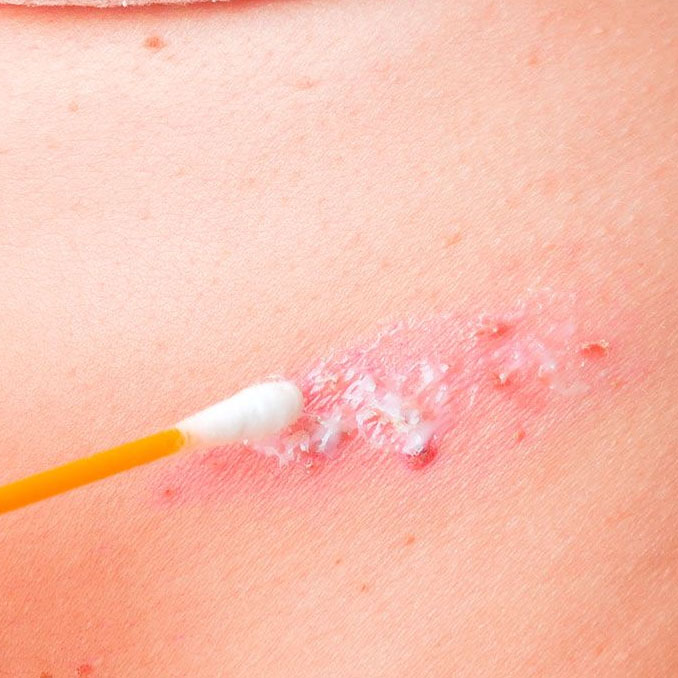 Consiste na aplicação de uma substância cáustica ou ácida sobre uma lesão, com o objetivo de removê-la. Após a aplicação do produto, a lesão fica esbranquiçada e pode arder. Ao redor do local tratado a pele pode ficar vermelha, irritada e até inchada. Nos dias subseqüentes, a área escurece e fica enrijecida, devido à morte das células.